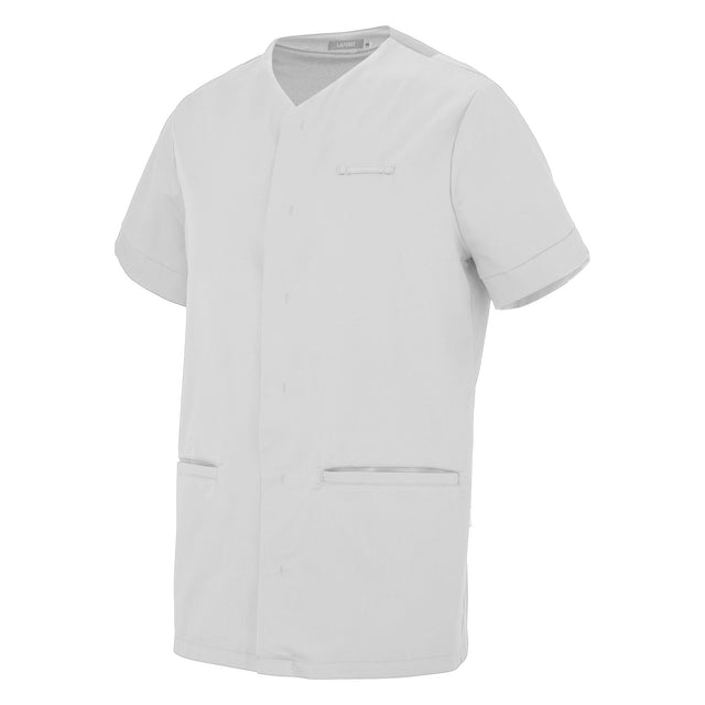 Practical elements include two spacious front pockets, a sleek sleeve trim, a badge holder, and a hanger loop. Embroidered ventilation eyelets further enhance comfort, making this men’s tunic both stylish and functional.